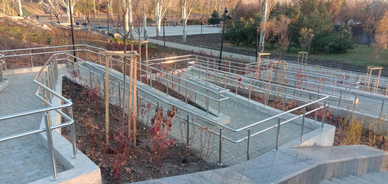 ……Поручні пандусів слід розташовувати на висоті 0,7 і 0,9 м, а в закладах дошкільної освіти - на висоті 0,5 м. Завершальні частини поручнів мають мати продовження по горизонталі на 30 см як вгорі, так і внизу…..